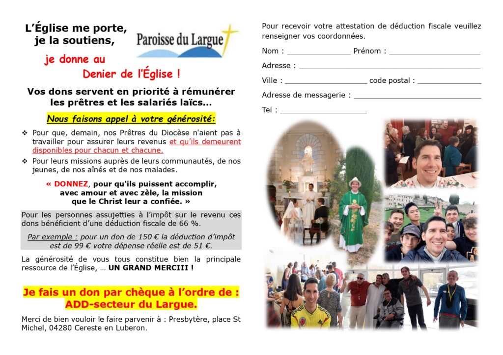 Vous savez que le Secteur Paroissial comme le Diocèse vit uniquement de vos Dons.