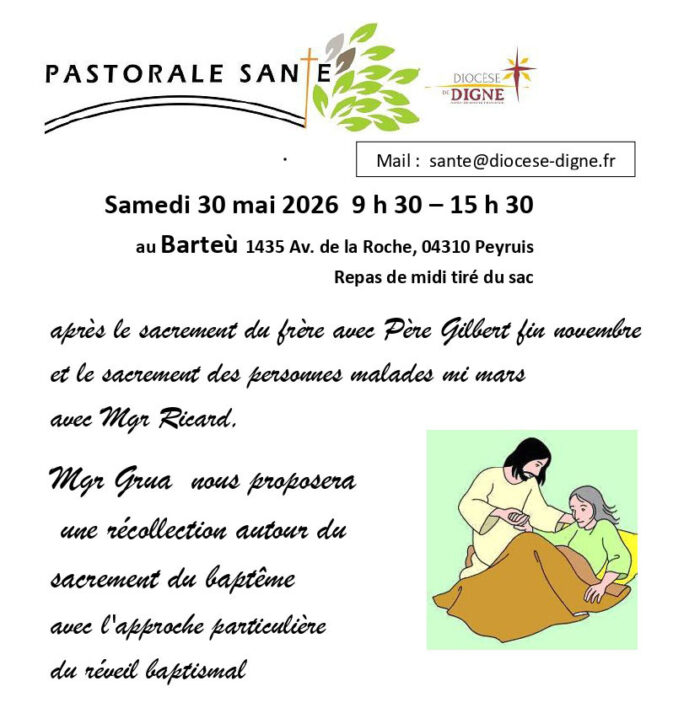 et le sacrement des personnes malades mi mars avec Mgr Ricard, Mgr Grua nous proposera une récollection autour du sacrement du baptême avec l’approche particulièredu réveil baptismal de 9 h 30 à 15h 30 au Bartèu (repas tiré du sac)