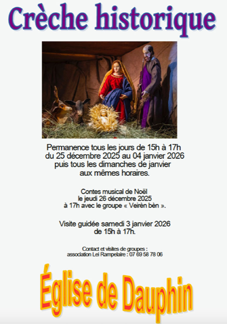 ∗ Crèche de Reillanne : tous les jours du 26/12 au 01/01 inclus de 14h à 17h. Les dimanches de janvier de 10h30 à 1230 et de 14h30 à 17h.